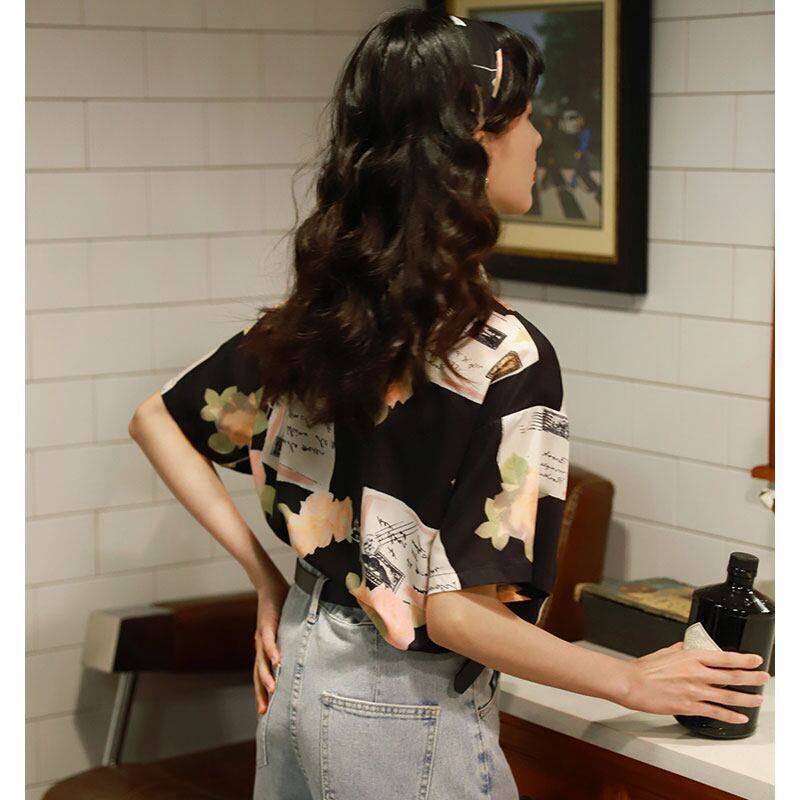 プリントシャツ レトロシャツ ガーリー モノトーン E332