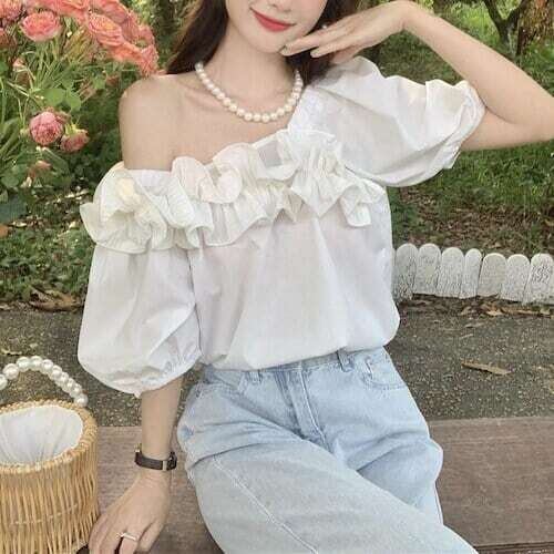 フリルトップス オフショル風 パフスリーブ ガーリー 通学 カジュアル E235