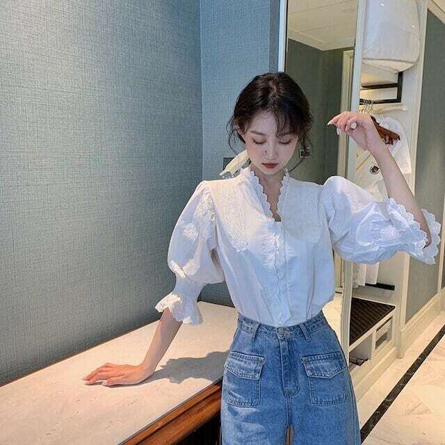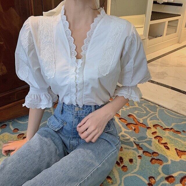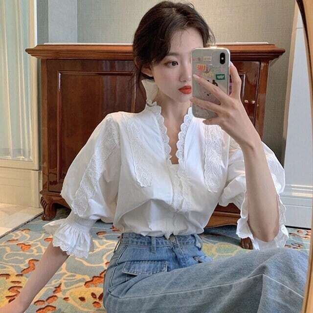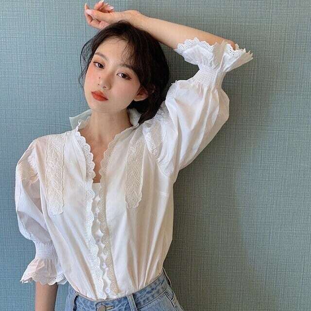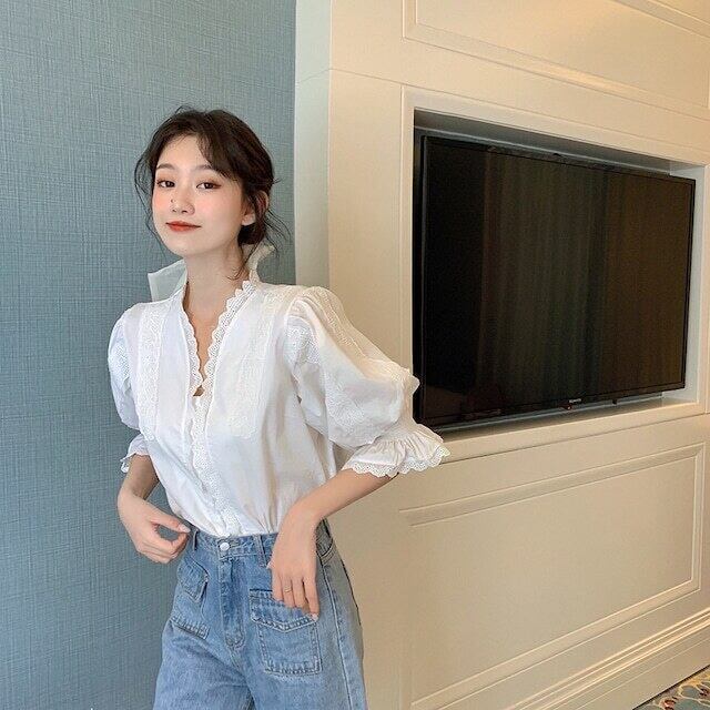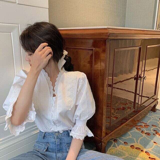 レースブラウス レトロブラウス トップス Vネック カジュアル ガーリー E181