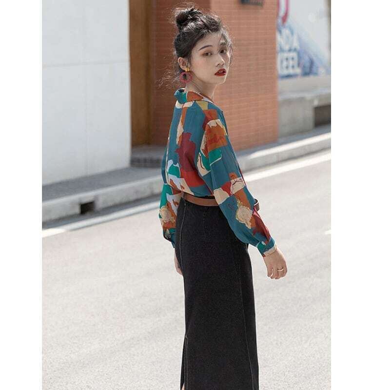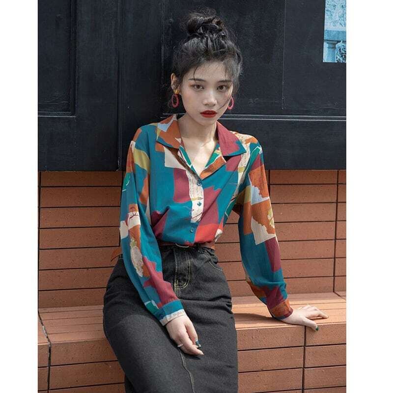 プリントシャツ 柄シャツ ブラウス カジュアル レトロ E447